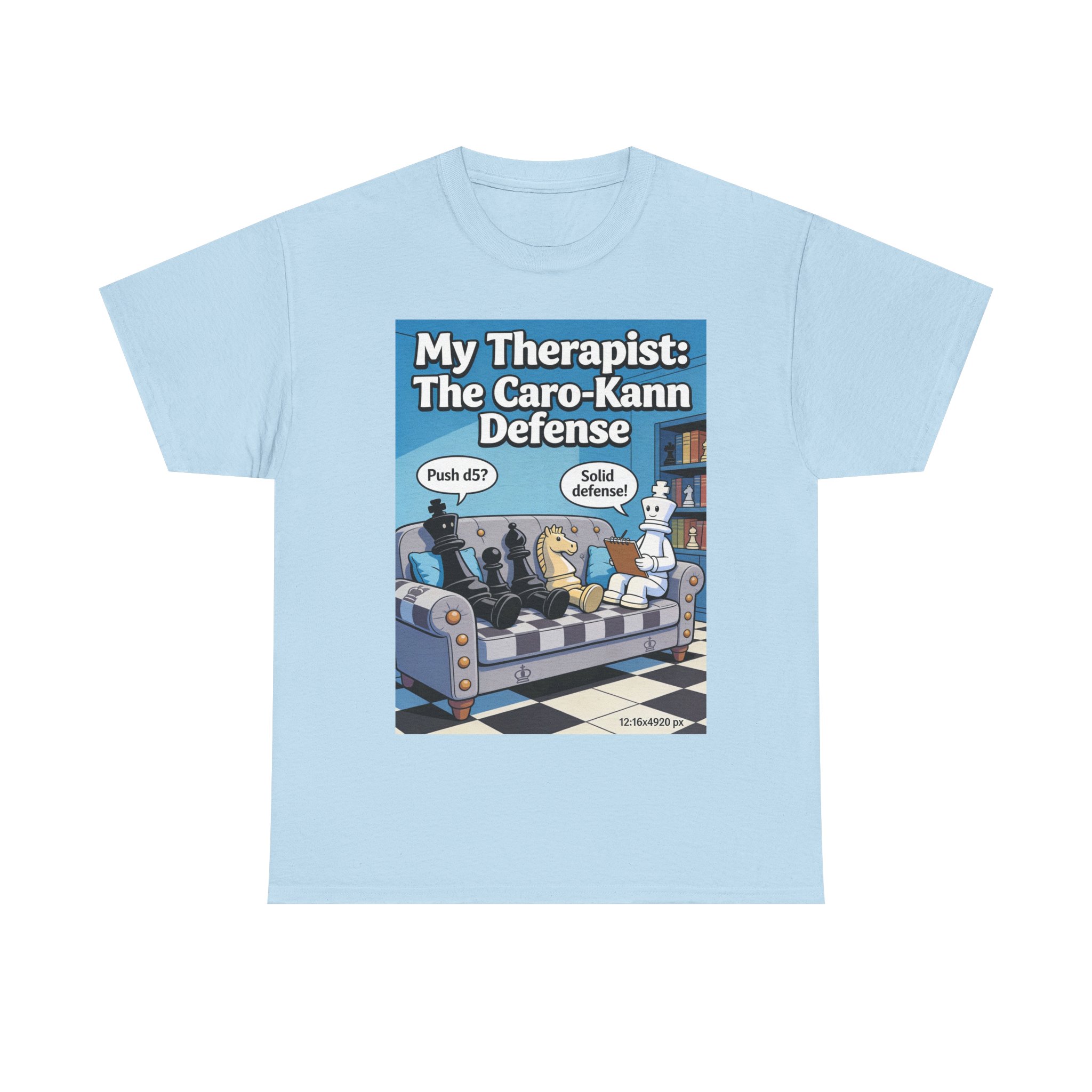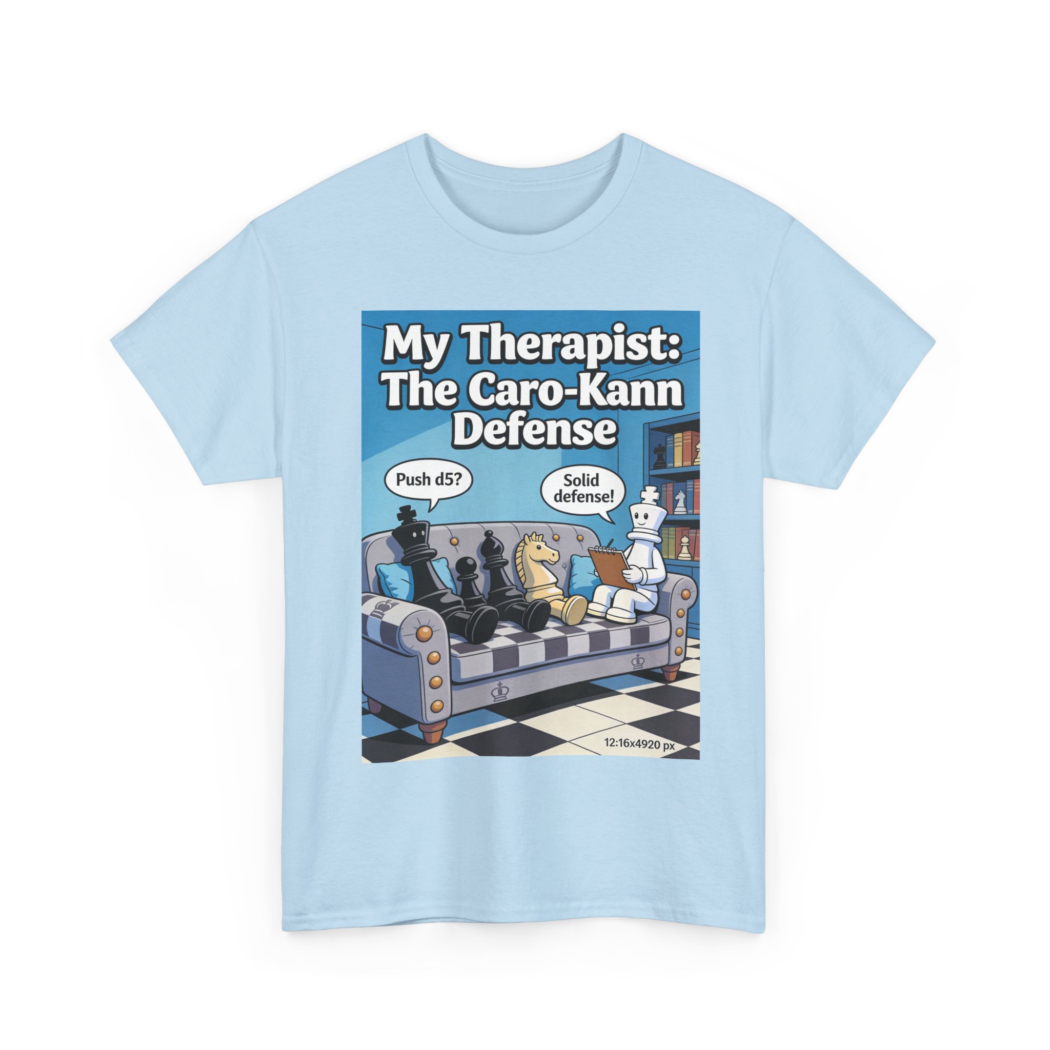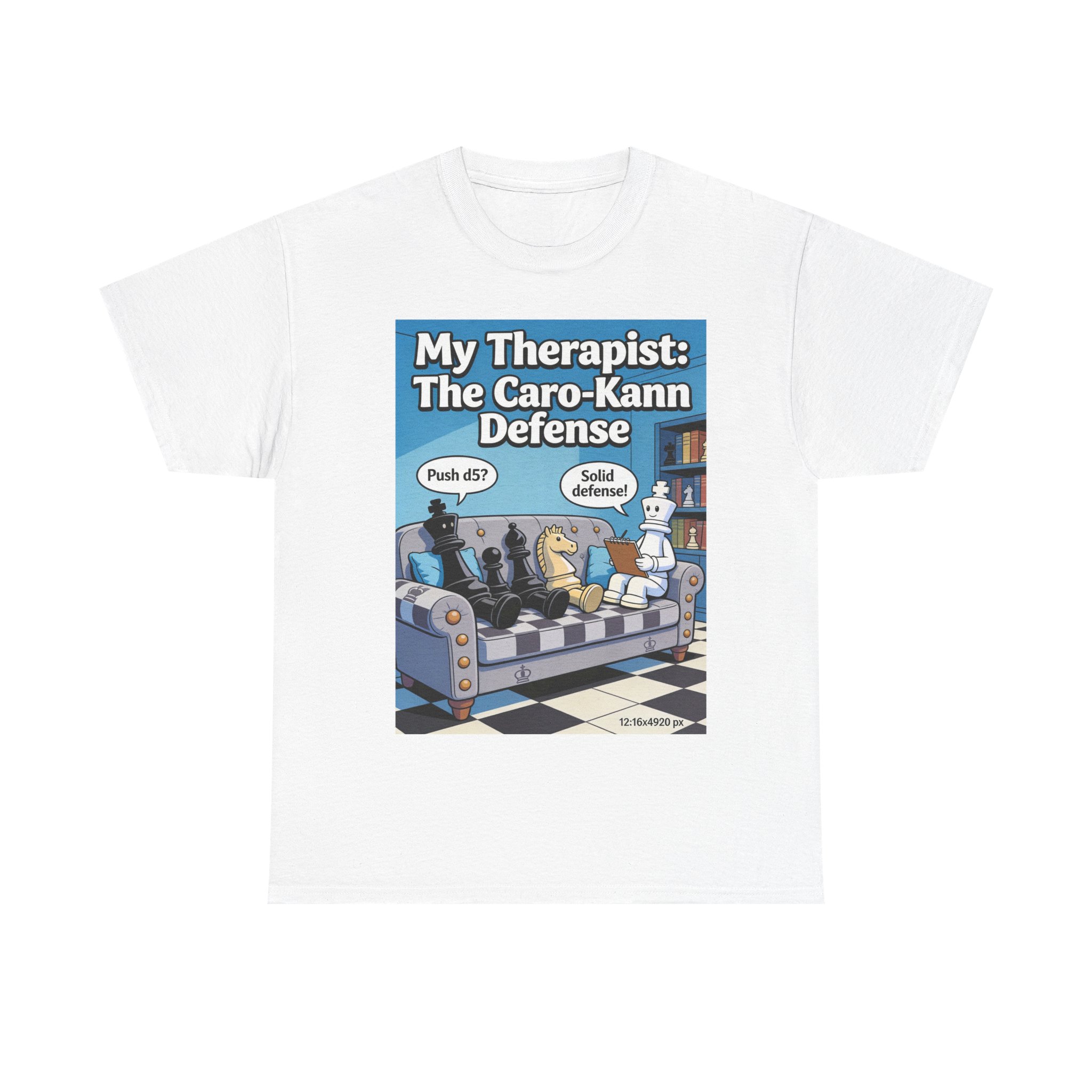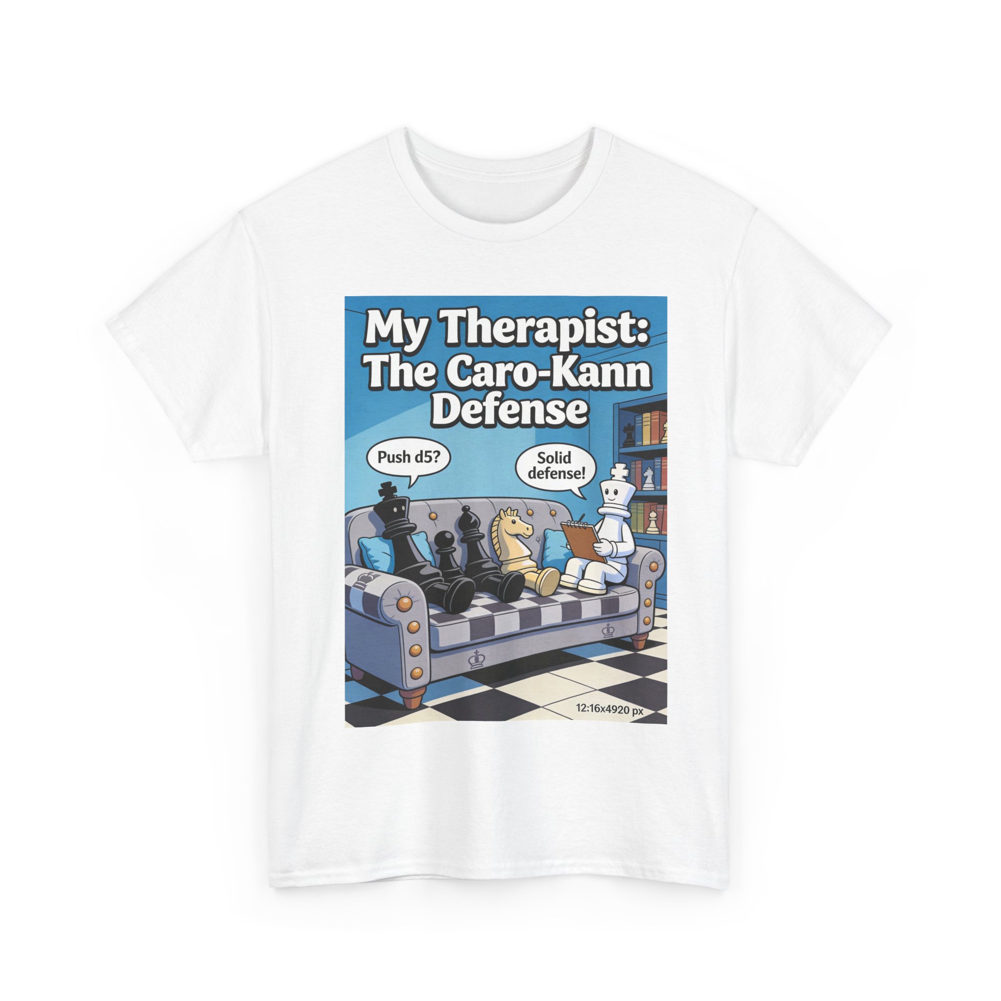 Slip into a tee that speaks chess. This lightweight classic carries a playful cartoon print showing a pawn on the couch confiding in a knight and rook — all under the headline “My Therapist: The Caro-Kann Defense.” The scene lands as a wink to players who find comfort in steady, calm positions and quiet, strategic thinking. Wear it to club nights, casual tournaments, or when you want to turn practice games into a conversation. The soft cotton body and neat crew neckline keep the focus on the art while giving relaxed, everyday comfort.