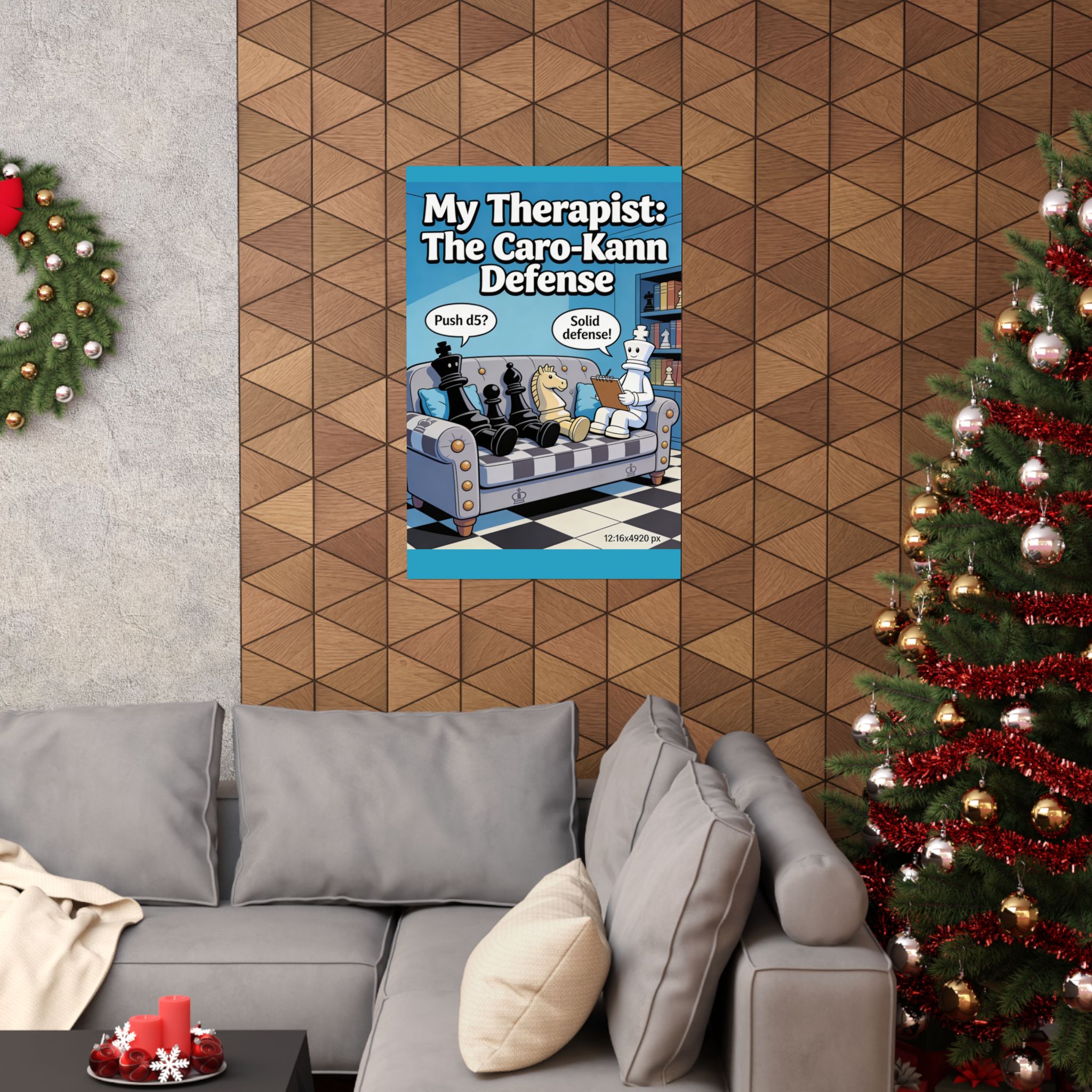This matte vertical poster brings chess humor and personality to any game room, study, or cozy corner. A comic-style scene shows chess pieces on a therapist’s couch with the headline “My Therapist: The Caro-Kann Defense,” blending playful strategy references with bright, museum-quality printing. The soft matte finish reduces glare while letting vivid giclée colors stay rich over time. Hang it in a den, chess club, or office to spark conversation, smiles, and a little tactical pride.